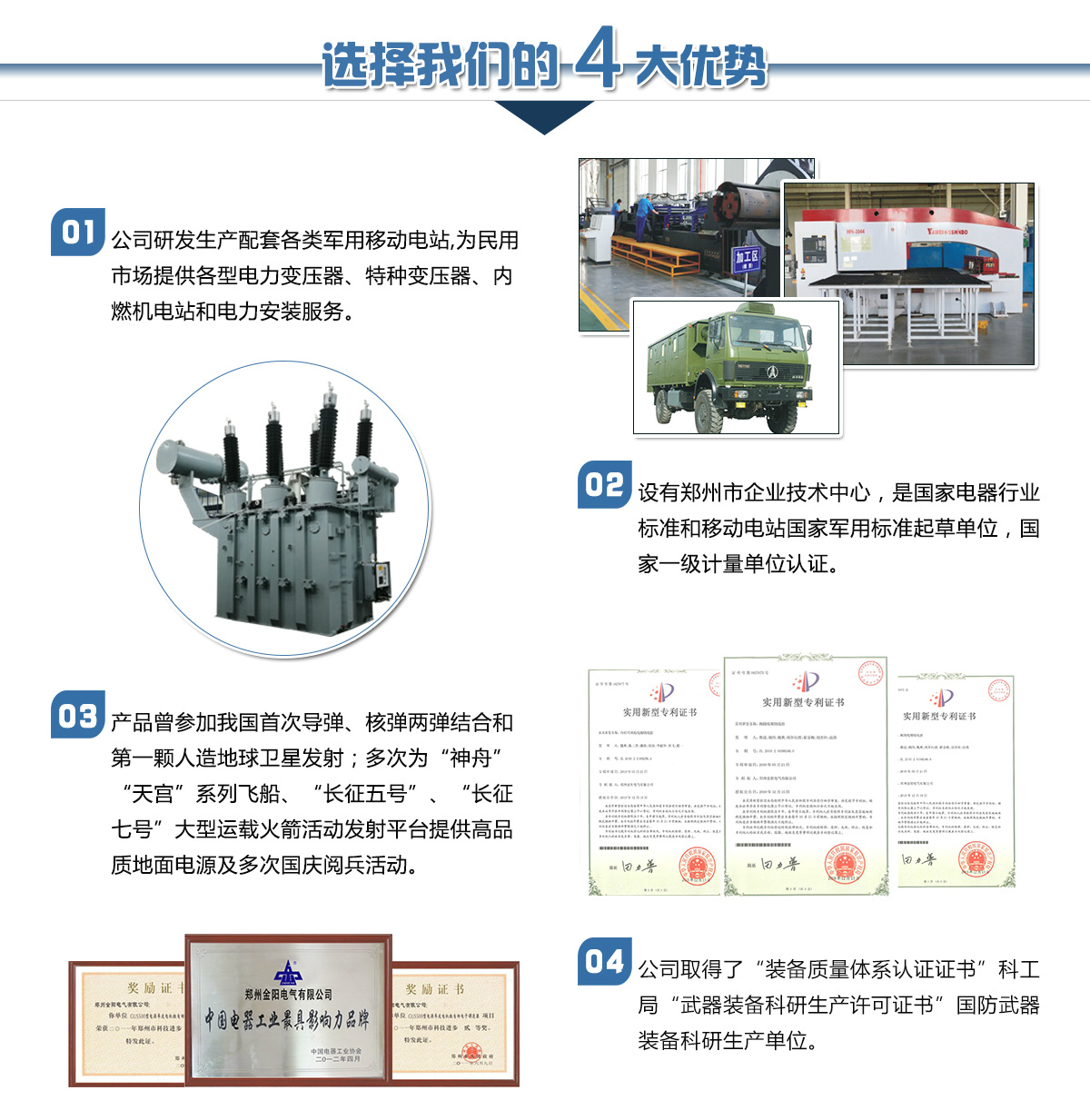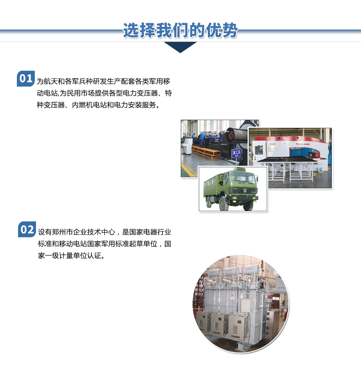鄭州金陽電氣有限公司是由鄭州市國資委控股的國有獨資企業(yè),是原機(jī)械工業(yè)部在上世紀(jì)五十年代投資建立的移動電站和電力變壓器生產(chǎn)企業(yè)。公司下設(shè)電站公司和變壓器公司及其它配套公司,長期以來在國內(nèi)移動電站和電力變壓器行業(yè)占有重要位置。是河南省具備設(shè)計生產(chǎn)110kV電壓等級以上電力變壓器資質(zhì)的企業(yè),是國家經(jīng)貿(mào)委首批推薦城鄉(xiāng)電網(wǎng)建設(shè)與改造所需變壓器的生產(chǎn)企業(yè)。河南省變壓器檢測中心設(shè)在我公司。